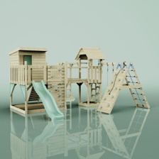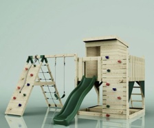 OutdoorToys Kiruna, Legetårn m/klatremodul og mørkegrøn rutsjebane, 380x357x274 cm