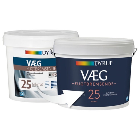 Dyrups fugtbremsende vægmaling glans 25 er en maling udviklet til fugtudsatte kældervægge. Anvendes indendørs på fugtpåvirkede vægge af f.eks. puds, beton og rå mursten i kældre. Det er en halvmat maling med god dækkeevne, der kan tones i lyse nuancer. Læs mere om vores gratis farvetoningsservice. Du kan beregne, hvor meget maling du behøver til dit projekt med Dyrups mængdeberegner.