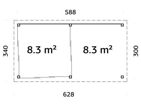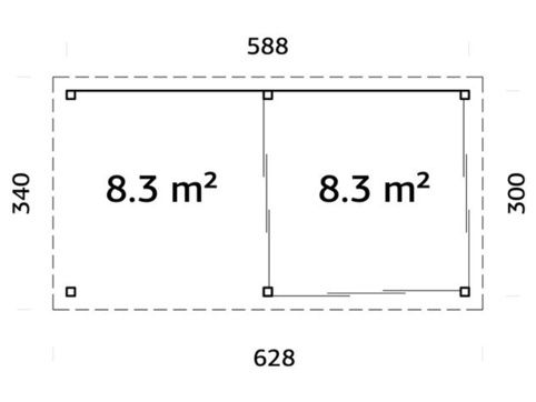 Annekset er af nordisk gran, hvor spærene er af lamineret træ. Husets vægmål er B: 588 cm x D: 300 cm x H: 245 cm, og det indvendige gulvareal er på 16,6 m². Tagbrædderne er med fer/not, og de er 19 mm tykke. Vægtykkelsen er 28 mm. Produktet er FSC®-mærket. OBS! Tagpap og gulv medfølger ikke og skal tilkøbes separat.