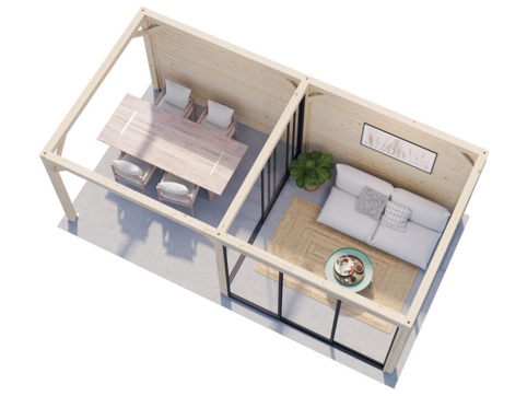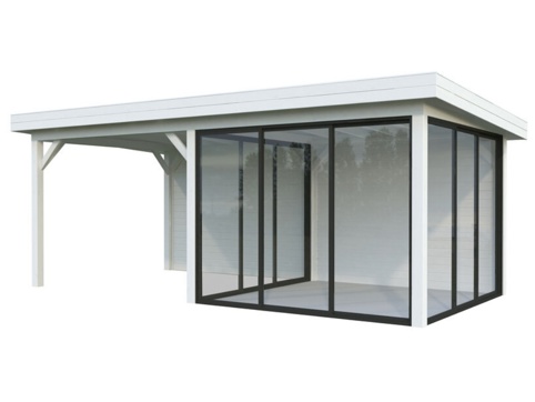 Her finder du dette super-skønne Lenna 706 anneks, der er 2-delt. Det har en flot overdækning, hvor 1 side er aflukket, og 1 rum med 3 sider med store skydedøre, som kan åbnes til begge sider og er låsbare – de består af 9 panoramavinduer i 4-16-4 mm hærdet sikkerhedsglas og aluminiumsprofiler. Huset er perfekt til ekstra plads ved sommerhuset eller i haven.
