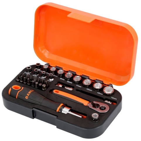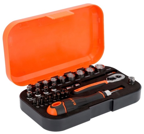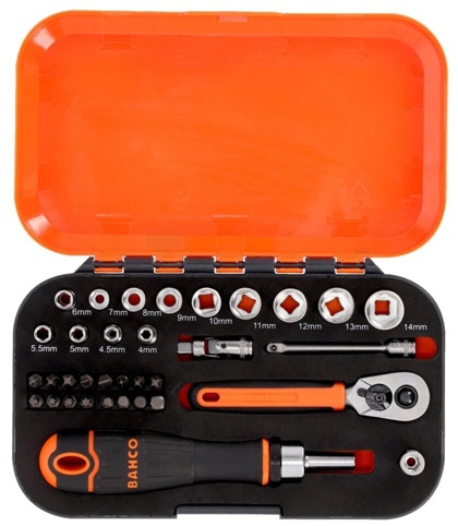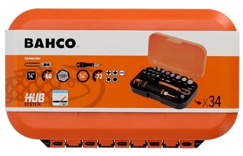 Her får du et topnøglesæt fra Bahco med 34 forskellige dele. Sættet indeholder 16 bits, der passer til følgende typer af skruer: ligekærv, Phillips, Pozidriv, sekskant samt TORX®. Derudover indeholder sættet også 13 sekskanttoppe, 1/4’’ Quick release skraldenøgle, 1/4” forlænger, 1/4" bitsholder, 1/4" kardanled, topadapter og 1/4" skraldeskruetrækker med bitsholder. Bitsene er lavet i højtlegeret stål med mikromat finish. Sættet leveres i en plastboks