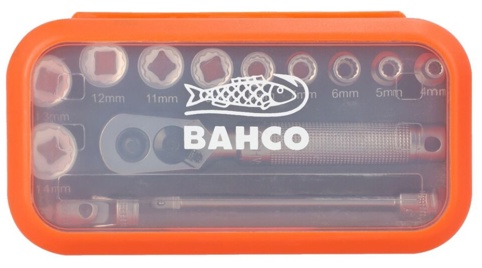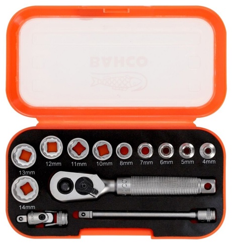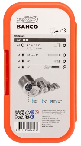 Her får du et topnøglesæt fra Bahco med 13 forskellige dele. Sættet indeholder 10 1/4" tolvkanttoppe i forskellige størrelser. Derudover indeholder sættet også en 1/4’’ Quick release skraldenøgle med metalhåndtag, 1/4” forlænger med kugle og 1/4" kardanled. Alle delene er lavet i robuste materialer. Sættet leveres i en plastboks