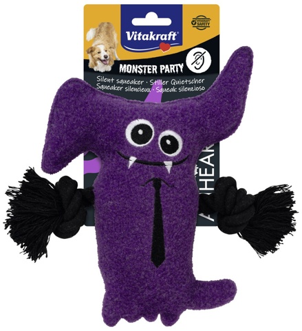 Monster Party fra Vitakraft er en serie med hundelegetøj, som har en silent squeaker kun hunde kan høre – og den vil derfor give ekstra underholdning og vil holde hunden beskæftiget. Legetøjet er fremstillet af et blødt og slidstærkt materiale, som er skånsomt for hundens poter. Den er ideel til leg både inden- og udendørs. Vær opmærksom på, at du ikke bør vaske dette tøjdyr.