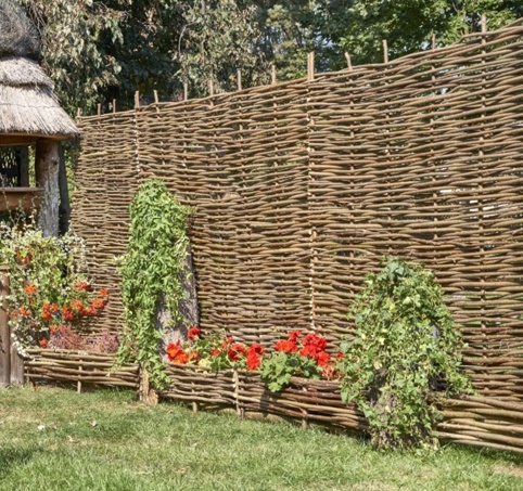 Bedkanten er fremstillet af hasseltræ, som er groft forarbejdet samt forstærket med galvaniseret tråd. Stolpens nederste 15 cm er beregnet til fastgørelse i jorden.
