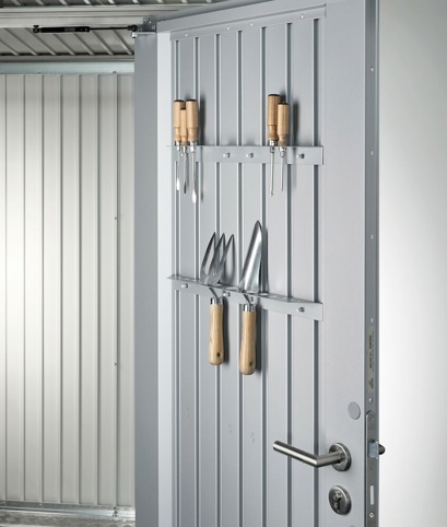 Parker din cykel, scooter og lignende, i skuret, så de kommer i tørvejr. Og hvis du vil integrere skuret mere, og samtidig gøre det hyggeligt omkring, kan du bygge en sti af sten eller grus hen til indgangen. Du kan også tilkøbe FloraBoard-blomsterkasse, hvori du kan plante blomster og tilføje mere farve til skuret. Der medfølger standardudstyr, som består af: 2 stk. værktøjsophæng, 2 stk. hylder, integreret tagrende med tilslutning til 5/4 tommer slange og 4 stk. redskabsholdere. Yderligere tilbehør kan du tilkøbe efter behov.