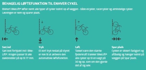 Den er nem og enkel at bruge, for du sætter blot cyklen i og trykker kort styret ned for at aktivere fjedermekanismen. Herefter vil cyklen blive trukket op af sig selv, og så bliver den sikkert fastgjort. For at sikre din cykel kan bruges hertil, kan du tjekke af via disse steps:
