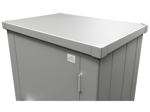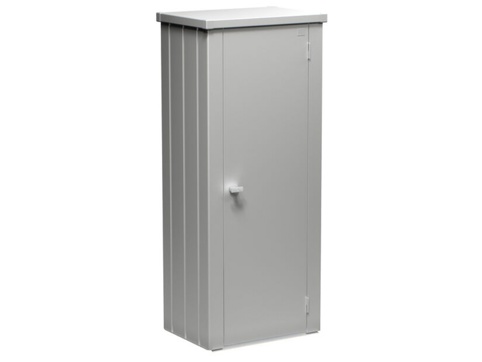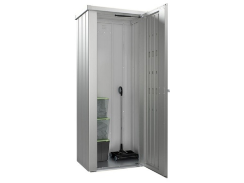 Her finder du et kompakt terrasseskab, som er perfekt til små udendørsarealer – også mindre altaner. Der medfølger standardudstyr, som består af: 1 hylde og organiseringssystem med 6 kroge. Derfor er skuret perfekt til opbevaring af grillredskaber, haveartikler, krukker og andre små ting – du kan også finde plads til dine havehynder herinde. Det er fremstillet af varmgalvaniserede og ovnemaljerede stålplader, mens hængsler og skruer er i rustfrit stål.