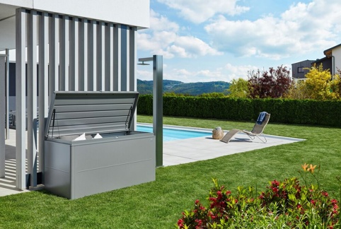 ’’Biohort LoungeBox’’-opbevaringsboks har et lækkert og helt enkelt design, som også kommer af materialet den er fremstillet af – låget er af pulverlakeret aluminium, og siderne er af varmgalvaniseret og polyamidbelagt stål. Så du får en opbevaringsbox både med et moderne design og af lækkert materiale – som passer ind i de fleste hjem. Specielt udenfor, da den er vandtæt.
