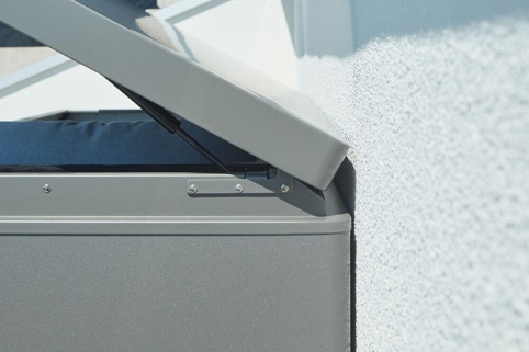 Låget på opbevaringsboksen er produceret af pulverlakeret aluminium, og sidevæggene er lavet af varmgalvaniseret, og skruer samt hængsler er i rustfri stål. Boxen har et flot og elegant design, som passer ind i det fleste haver – og med de forskellige farver, kan derfor nemt findes en, som passer til din have og så er den vandtæt.