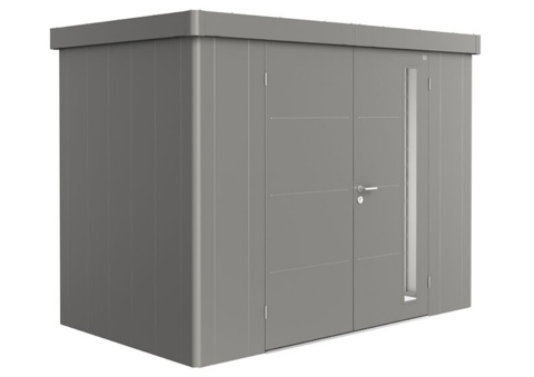 Du får her et ”Biohort Neo”-redskabsskur, som er fremstillet og udført af varmgalvaniserede og ovnemaljerede stålplader. Det måler D: 292 cm x B: 180 cm x H: 222 cm, og har et areal på 5,3 m². Redskabsskuret er desuden vedligeholdelsesfrit, og det har 20 års garanti. De medfølgende hylder og redskabsholdere er fremstillet af galvaniseret stål og efterfølgende lakeret gråhvid. Tagkonstruktionen, som også medfølger, er af trækrydsfinér med EPDM-tagmembran. Derudover er 3-punkts cylinderlåsen med et håndtag af rustfrit stål. Skuret her er med standarddør, og det har et akrylglaspanel integreret, som tilføjer lys ind i skuret.