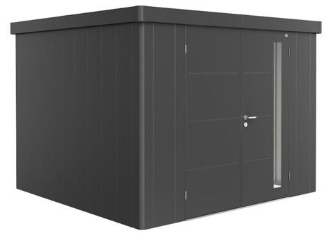 Du får her et ”Biohort Neo”-redskabsskur, som er fremstillet og udført af varmgalvaniserede og ovnemaljerede stålplader. Det måler D: 292 cm x B: 292 cm x H: 222 cm, og har et areal på 8,5 m². Redskabsskuret er desuden vedligeholdelsesfrit, og det har 20 års garanti. De medfølgende hylder og redskabsholdere er fremstillet af galvaniseret stål og efterfølgende lakeret gråhvid. Tagkonstruktionen, som også medfølger, er af trækrydsfinér med EPDM-tagmembran. Derudover er 3-punkts cylinderlåsen med et håndtag af rustfrit stål. Skuret her er med standarddør, og det har et akrylglaspanel integreret, som tilføjer lys ind i skuret.