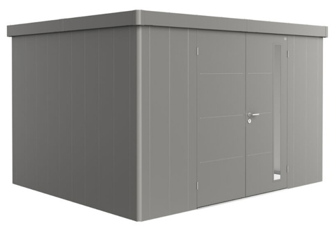Du får her et ”Biohort Neo”-redskabsskur, som er fremstillet og udført af varmgalvaniserede og ovnemaljerede stålplader. Det måler D: 348 cm x B: 292 cm x H: 222 cm, og har et areal på 10,2 m². Redskabsskuret er desuden vedligeholdelsesfrit, og det har 20 års garanti. De medfølgende hylder og redskabsholdere er fremstillet af galvaniseret stål og efterfølgende lakeret gråhvid. Tagkonstruktionen, som også medfølger, er af trækrydsfinér med EPDM-tagmembran. Derudover er 3-punkts cylinderlåsen med et håndtag af rustfrit stål. Skuret her er med standarddør, og det har et akrylglaspanel integreret, som tilføjer lys ind i skuret.
