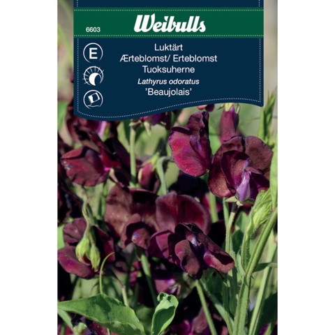 Denne Beaujolais-variant af ærteblomsten er en klatrevækst med en skøn duft, som blomster i en dyb, rød farve. Det er bare to af fordelene ved at dyrke den smukke blomst i haven. Den kan dyrkes tæt ved et stakit, pergola eller andet, som den kan klatre op ad. Ærteblomstens blomstring forlænges, hvis du flittigt fjerner de visne blomster løbende.