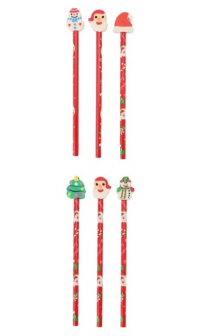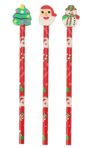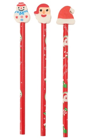 Du finder her en pakke med 3 forskellige blyanter, som har et viskelæder på toppen, der har et julemotiv. Denne vare er assorteret, og du kan ikke vælge farve online.