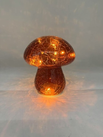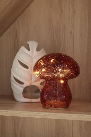 Denne dekorative bordlampe er designet som en svamp og tilføjer et blødt, stemningsfuldt lys til ethvert rum. Indeni lampen gemmer der sig en lyskæde med 10 små LED-lys, som skaber et varmt og hyggeligt skær. Bordlampen kombinerer et legende design med funktionel belysning, og den er perfekt til soveværelset, børneværelset eller en hyggelig krog i stuen. Lampen er af glas og måler Ø: 13 cm x H: 15,5 cm. Den bruger 3 x AAA-batterier, som ikke medfølger.