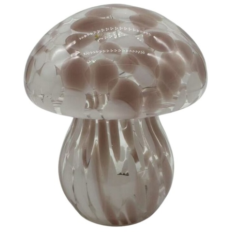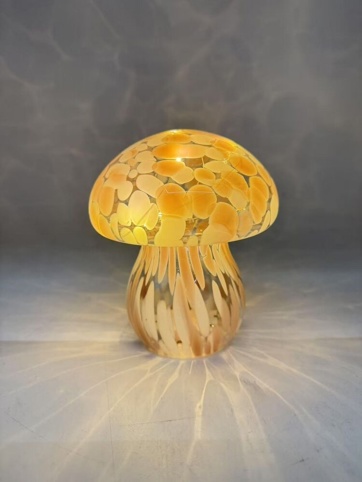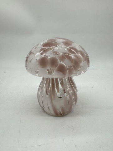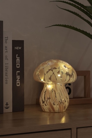 Denne dekorative bordlampe er designet som en svamp og tilføjer et blødt, stemningsfuldt lys til ethvert rum. Indeni lampen gemmer der sig en lyskæde med 10 små LED-lys, som skaber et varmt og hyggeligt skær. Bordlampen kombinerer et legende design med funktionel belysning, og den er perfekt til soveværelset, børneværelset eller en hyggelig krog i stuen. Lampen er af glas og måler Ø: 13 cm x H: 15,5 cm. Den bruger 3 x AAA-batterier, som ikke medfølger.