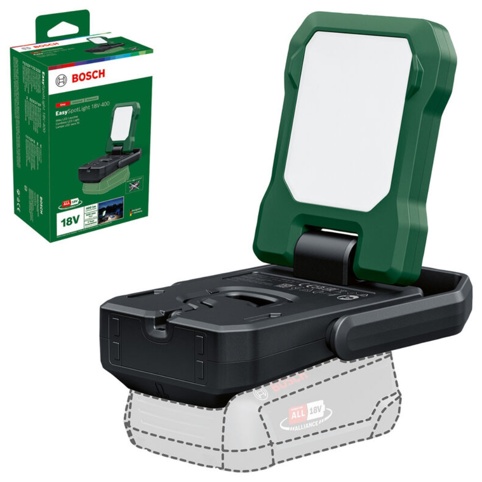 EasySpotLight 18V-400 leveres uden batteri og lader. Til maskinen skal du bruge 1x 18 V Bosch Power for All-batteri med en kapacitet på 1,5 Ah eller derover.