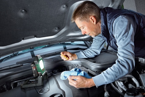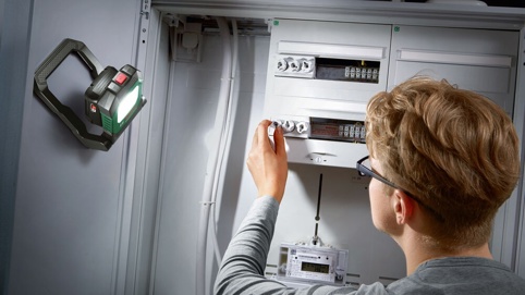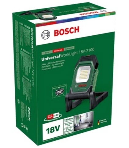 UniversalWorkLight 18V-2100 leveres uden batteri og lader. Til maskinen skal du bruge 1x 18 V Bosch Power for All-batteri med en kapacitet på 1,5 Ah eller derover.