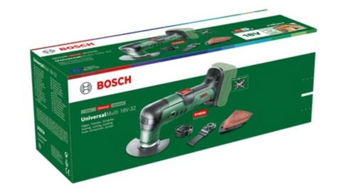 UniversalMulti 18V-32 en solo maskine, hvilket vil sige, at den leveres uden batteri og lader. Til maskinen skal du bruge 1x 18 V Bosch Power for All-batteri med en kapacitet på 1,5 Ah eller derover.