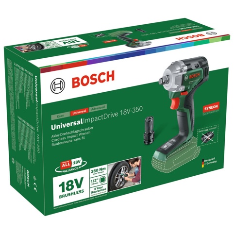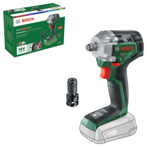 UniversalImpactDrive 18V-350 er en solo maskine, hvilket vil sige, at den leveres uden batteri og lader. Til maskinen skal du bruge 1x 18 V Bosch Power for All-batteri med en kapacitet på 1,5 Ah eller derover.
