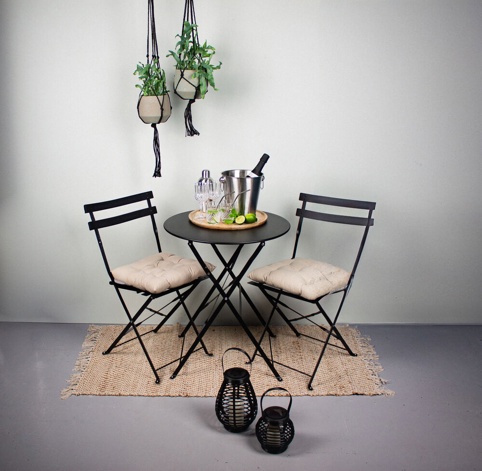 Med cafésættet får du plads til 2 personer. Både bord og stole er fremstillet af sort power-coated stål, som også har fået en E-coating. Dette er en proces hvor man anvender elektricitet til at påføre maling, på et metallisk objekt. Det giver et flot resultat, med en finish i højeste kvalitet. Samt tilføjer en slidstærk film, som er med til at beskytte og forlænge holdbarheden.