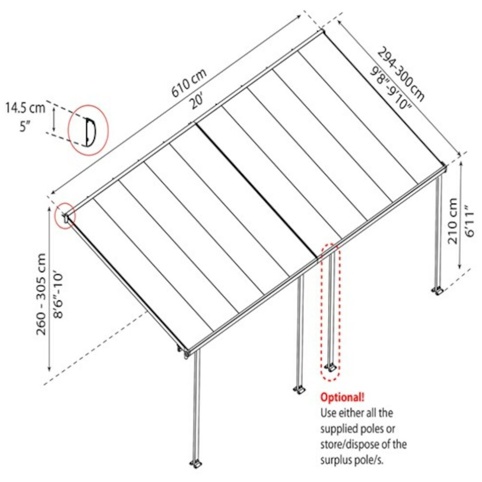 ”Canopia Feria”-terrasseoverdækningen består af 2 terrasseoverdækninger, forankringskit og et samlekit, og der er 10 års produktgaranti. Den er opbygget af et gennemsigtigt tag af 8 mm dobbeltlags polycarbonatplader, mens konstruktionen er en pulverlakeret aluminiumramme. Desuden har terrasseoverdækningen en indbygget tagrende.