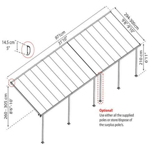 ”Canopia Feria”-terrasseoverdækningen består af 2 terrasseoverdækninger, forankringskit og et samlekit, og der er 10 års produktgaranti. Den er opbygget af et gennemsigtigt tag af 8 mm dobbeltlags polycarbonatplader, mens konstruktionen er en pulverlakeret aluminiumramme. Desuden har terrasseoverdækningen en indbygget tagrende.