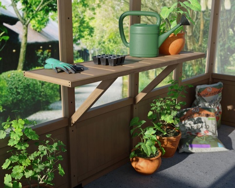 Hyldesættet til Canopia Natura drivhuse gør det nemt at skabe ekstra plads og orden i drivhuset, så du får bedre arbejdsro, når du prikler, sår og passer dine planter. Hylden giver en fast plads til potter, småplanter og drivhustilbehør, så du kan udnytte højden og holde gulvpladsen fri til større krukker og plantekasser. Hylden er fremstillet i cedertræ, som er kendt for sin holdbarhed og naturlige modstandsdygtighed over for råd og skadedyr, hvilket gør det særligt velegnet i et drivhusmiljø. Den monteres direkte på drivhusets ramme, og der medfølger beslag og skruer.