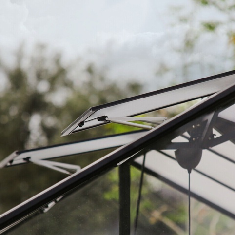 Indeklimaet understøttes af to store automatiske tagventiler, som sørger for god luftcirkulation uden brug af strøm, og de dobbelte svingdøre giver nem adgang samt masser af frisk luft. Dørene kan placeres både foran og på siden, så du kan tilpasse indgangen efter placering og behov.