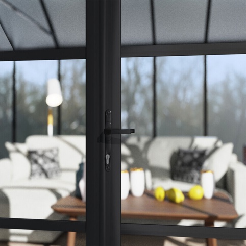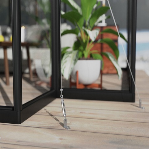 Orangeriet er bygget til udendørs brug med en stabil base i galvaniseret stål og interne forstærkninger, som bidrager til en holdbar konstruktion med minimal vedligeholdelse. Taget er udført i multivægspaneler, der dæmper den skarpe sol, mens vægpanelerne giver et meget højt lysindfald, så du får gode betingelser for planter og en behagelig atmosfære. Derudover er der et integreret regnvandssystem, som leder vandet væk og kan bruges til havevanding. Triomphe er udviklet til nordiske forhold og er angivet til vind op til 33 m/s samt snebelastning op til 80 kg/m².OBS! Der ydes ingen garanti på drivhuset mod stormskader. Vær opmærksom på, at drivhuset ikke bør placeres et sted, der er frit og åbent – hvor det er ekstra udsat for vind og vejr.