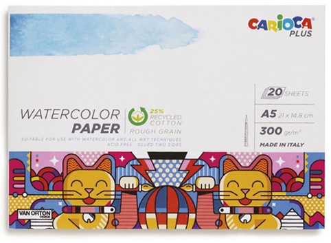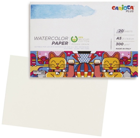 Med en blok får du kvalitetsark til at skabe fine malerværker eller bruge som prøveark. Denne blok fra Carioca Plus er udviklet til akvarelmaling og andre vådteknikker. Blokken består af 20 ark i A5-størrelse og vejer 300 g/m². Den er bloklimet på 2 sider, og papiret er meget kraftigt, grovkornet og syrefrit med 25 % genanvendte bomuldsfibre.