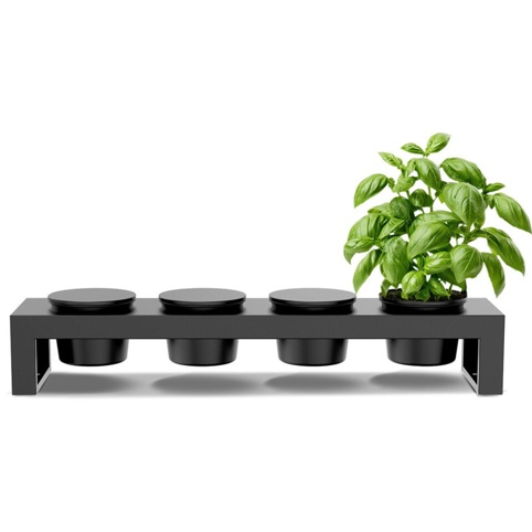 Cozze Topping Station er designet som et minimalistisk, grafisk element til udekøkkenet. Den lave, aflange ramme i mat sort stål fremhæver de lige, skarpe linjer og giver et rent, sammenhængende look på bordpladen. Fire nedfældede beholdere med plane låg ligger i flugt med overfladen, så helheden står stringent og moderne – samtidig med at dine toppings, urter og små råvarer er organiseret og lige ved hånden.