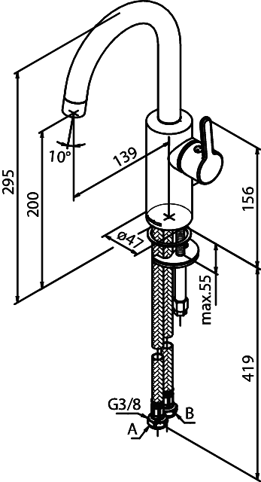 Tilslutningsslangerne har gevindstørrelsen 3/8". Der medfølger ikke bundventil. Silhouet-håndvaskarmaturer fås i 3 størrelser samt denne model med høj C-tud. Tuden har en højde på 295 mm. Følg nøje den medfølgende rengøringsvejledning for at bevare den flotte overflade og undgå skader på armaturet. Der er 5 års garanti mod kvalitets- og funktionsfejl på produktet.