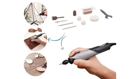 Med 15 medfølgende tilbehørsdele får du alt, hvad du skal bruge til at komme i gang med dine projekter. Uanset om du vil dekorere glas, rense smykker eller slibe kanter, kan du hurtigt skifte mellem funktioner takket være multispændepatronen, der gør det muligt at skifte tilbehør helt uden brug af værktøj.