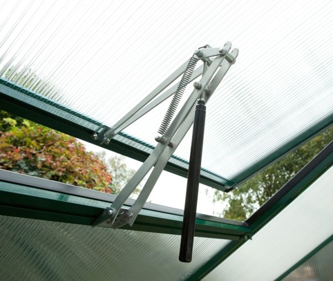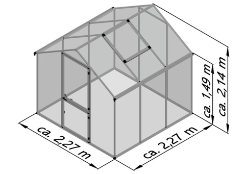 Drivhuset er bygget med et stabilt aluminiumsprofilsystem og beklædt med isolerende polycarbonatplader, der hjælper med at holde på varmen. Tagvinduet leveres med automatisk vinduesåbner, så drivhuset selv kan hjælpe med at lufte ud, når temperaturen stiger – en stor fordel på solrige dage, hvor planterne hurtigt kan få det for varmt. Pladerne er fuldt indrammede i konstruktionen, så du får en robust løsning uden løse clips, og overfladen er UV-beskyttet for lang holdbarhed. Du skal være opmærksom på, at der ikke medfølger fundamentsramme hertil.