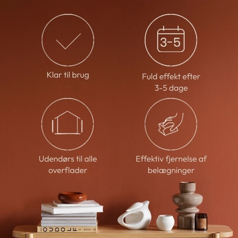 Fjern de grimme, grønne belægninger på dit tag og din husfacade ― dette produkt kan afhjælpe dine problemer. Først anbefaler vi, at du fjerner de tykke lag af belægning med en børste og rengør overfladen med grundrens. Rens af med vand, mens overfladen stadig er fugtig, og påfører så dette produkt.