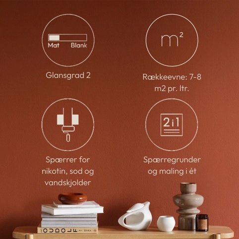 Malingen rækker forventeligt 8-10 m² pr. ltr. Hvis du har vægge og lofter, som har oplevet påvirkning af nikotin, skjolder efter vandskader eller måske sod, da er det afgørende, at du vælger et spærrende produkt. Du kan også vælge en spærregrunder og en særskilt færdigmaling, hvis du ønsker det. Vær dog opmærksom på, at dette er produkter til indendørs brug. Se efter vores Gori-produkter for udendørsmaling