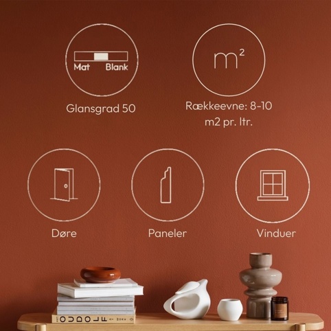 Husk at omrøre malingen godt, inden du går i gang. Hvis du finder en * på emballagen, kan det være nødvendigt at anvende en grundfarve før brug. Ellers får du ikke den ønskede farve. Påfør 2-3 lag med 6 timers mellemrum. Malingen er berøringstør efter ca. en times hærdning.Du kan forvente, at malingen er helt gennemhærdet efter ca. 4 uger. Mængden af maling er forventet at være ca. ca. 8-10 m² pr. ltr. Påfør med pensel, rulle eller sprøjte. Når du arbejder med malingen og også under tørringen, bør der være mindst 5 grader i rummet og en luftfugtighed under 80 %.
