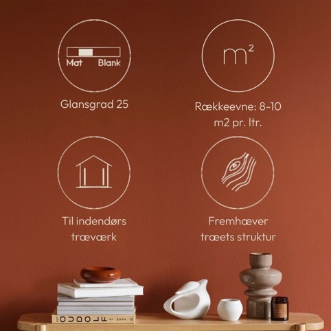 Denne transparente træmaling er ideel til brug på større træoverflader i dit hjem, f.eks. på trævægge, -lofter eller -møbler. Vigtigt er det blot, at du kun bruger malingen indendørs. Malingen til træ fremhæver smukt den naturlige struktur i træet. Den opfrisker også nemt træværk, som med tiden er blevet lidt gult. Du kan tone træmalingen i mange forskellige transparente nuancer.