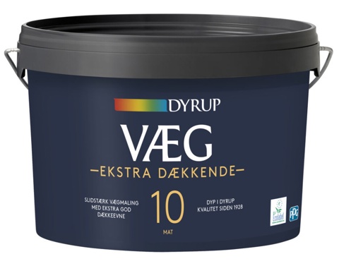 Dyrup 10 Ekstra Dækkende Vægmaling er en slidstærk vandbaseret akrylmaling, der er særligt velegnet til rum med moderat slid på væggene, såsom stuer og soveværelser. Malingen kan bruges på stort set alle indendørs vægflader af puds, gips, sandspartel, beton, tapet, glasvæv og filt. Den rækker til ca. 8-10 m² væg pr. liter. Malingen er hvid, mat og har glans 10.