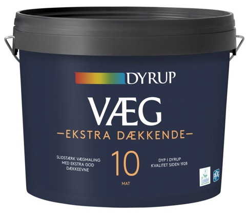 Dyrup 10 Ekstra Dækkende Vægmaling er en slidstærk vandbaseret akrylmaling, der er særligt velegnet til rum med moderat slid på væggene, såsom stuer og soveværelser. Malingen kan bruges på stort set alle indendørs vægflader af puds, gips, sandspartel, beton, tapet, glasvæv og filt. Den rækker til ca. 8-10 m² væg pr. liter. Malingen er hvid, mat og har glans 10.
