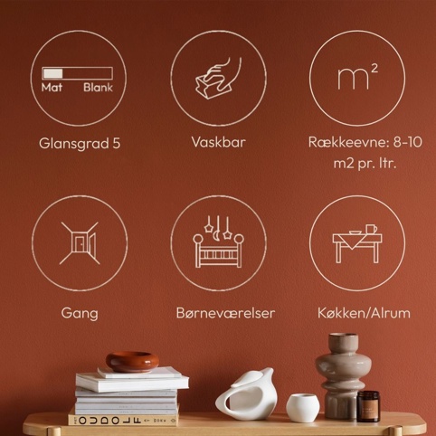 Er du vild med det matte look på væggene? Men har du samtidig brug for at skabe en vaskbar overflade i enten køkken, bryggers eller på børneværelset? Her har du løsningen. Denne hvide Dyrup-maling sikrer dig en mat og vaskbar overflade med glans 5. Du kan bruge den i alle rum, omend ikke i deciderede vådzoner. Når produktet er gennemtørt, tåler det rengøring med almindelige rengøringsmidler.