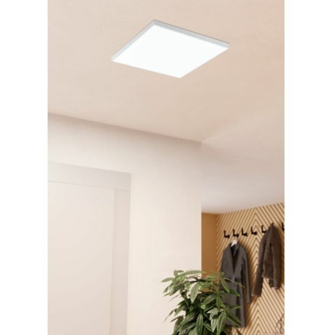 Lampen er i hvidt aluminium og stål og har hvid skærm i plast. Den måler L: 28,7 cm x B: 28,7 cm x H: 6,2 cm, og passer altså i størrelsen ind i næsten alle rum og også i mindre kroge. Den har IP20-klassificering, og er kun egnet til indendørs brug og ikke i vådrum. OBS! Dette produkt indeholder LED-lyskilde, som ikke kan udskiftes.