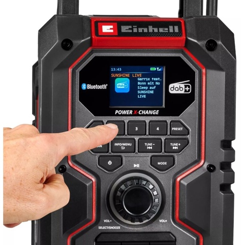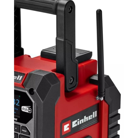 Vil du skabe god stemning i garagen, på arbejdspladsen eller i haven, er denne arbejdsradio fra Einhell et must. Radioen kan både bruges med batteri (ekskl.) eller med det medfølgende 1,8 m lange strømkabel. Den sammenklappelige, stødsikre antenne sikrer optimal modtagelse af digitale DAB+ og FM-kanaler, og med hukommelsespladser til 30 kanaler af hver type kan du altid finde dine favoritter nemt og hurtigt. Du kan også bruge den automatiske søgefunktion, der gør det let at finde kanaler. TFT-farvedisplayet med RDS-funktion viser information som f.eks. sangtitel, kanalnavn og trafikoplysninger.