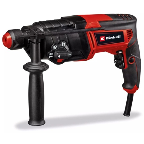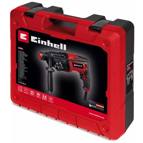 Einhell TC-RH 800 4F er en kraftfuld 800 W borehammer, der er skabt til både renovering, modernisering og lettere nedbrydningsopgaver. Med fire funktioner: boring, hammerboring samt mejsling med og uden fiksering, får du et alsidigt værktøj, der kan løse mange forskellige opgaver i beton, murværk og sten. Det pneumatiske slagværk leverer en slagkraft på 2,6 J og gør det muligt at bore i beton op til 26 mm.