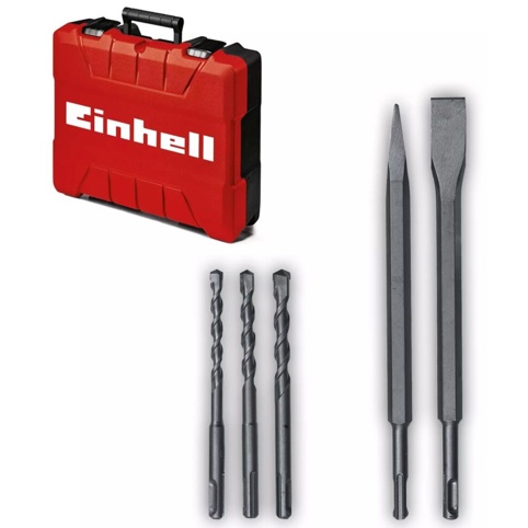 Værktøjsholderen er en SDS-plus-fatning med halvautomatik, som gør skift af bor og mejsler hurtigt og nemt. Sættet leveres komplet med 3 bor (Ø 8, 10, 12 mm) samt både spids- og fladmejsel. Alt opbevares sikkert i den medfølgende E-Box transport- og opbevaringskuffert, så du altid har udstyret samlet og klar til brug.