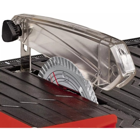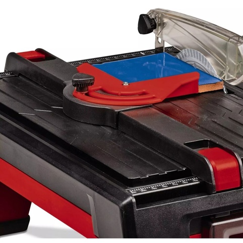 Den indbyggede vandbeholder sørger for, at skæreskiven køles under skæring, hvilket gør processen både mere kontrolleret og mere skånsom for materialet. Det justerbare vinkelanslag giver mulighed for geringssnit mellem 0° og 90°, og parallelanslaget med skala hjælper dig med at holde linjen præcis, når du skal lave lange, lige snit.