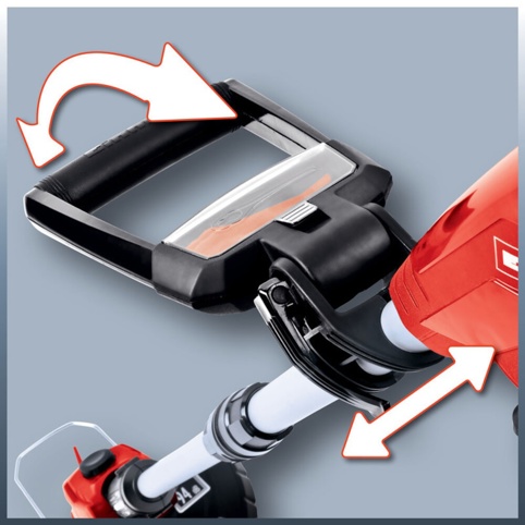 Motordelen kan drejes i 90 grader og vippes i 5 vinkler. Græstrimmeren kommer desuden med 20 robuste plastknive, som kan opbevares i det indbyggede rum på skaftet. Denne model har desuden et smart trinløst teleskopskaft, så du kan indstille den præcist til netop din højde. Og det behagelige støttegreb har ligeledes trinløs justering, som sørger for, at du får en god arbejdsstilling.
