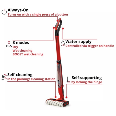 Einhell CLEANEXXO gulvvasker er et effektivt alternativ til den klassiske gulvmoppe og et oplagt supplement til støvsugeren, når gulvene skal være helt rene. Vandtilførslen styres direkte fra håndtaget, så du nemt kan tilpasse mængden efter behov, mens standard- og BOOST-tilstand gør det muligt både at klare både let snavs og mere genstridige pletter. Den roterende valse fugtes automatisk fra rentvandstanken og opsamler samtidig snavset i en separat tank, så du hele tiden arbejder med rent vand. Begge tanke er nemme at tage ud, så påfyldning og tømning hurtigt er klaret. Maskinen kan også bruges til at aftørre gulvet uden vand, hvis du blot vil fjerne fugt.