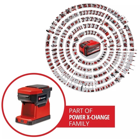 Er du på byggepladsen, på camping eller bare et sted uden stikkontakt? Så er Einhells batteridrevne kaffemaskine din nye bedste ven. Den kan både brygge klassisk filterkaffe og kaffe med kapsler. Maskinen brygger ved op til 80 °C, og kaffen er klar på ca. 5 minutter, fra du starter maskinen. Den aftagelige beholder rummer 240 ml vand, hvilket svarer til en stor kop kaffe.